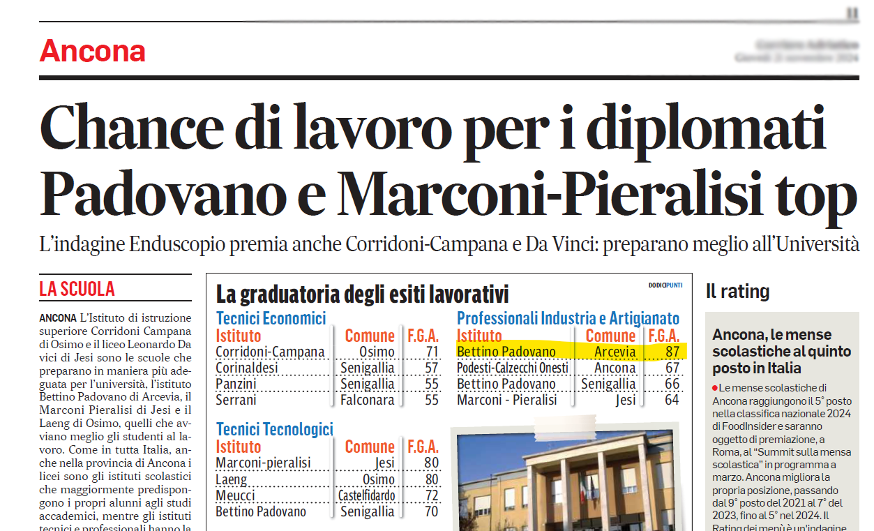 Anche quest’anno l’istituto Corinaldesi Padovano di Arcevia conferma come migliore Istituto professionale marchigiano in termini di occupabilità dei suoi diplomati, con oltre l’87% di studenti impiegati in attività lavorative a soli sei mesi dal diploma di maturità.